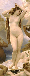 Zeus và Dione. Nhưng theo Thần phả (Θεογονία Theogonia) của Hesiod thì Aphrodite sinh ra từ bọt biển (aphros = bọt sóng), do bộ phận sinh dục của Uranus bị Cronus chém rơi xuống biển. Aphrodite trần truồng nổi lên trên những bọt sóng biển, cỡi lên một vỏ sò; trước tiên nàng đến đảo Kythira nhưng khi thấy rằng đó chỉ là một đảo nhỏ nên nàng đến Peloponnese và cuối cùng ở tại Paphos, nơi này sẽ là nơi thờ phụng chính của nàng.