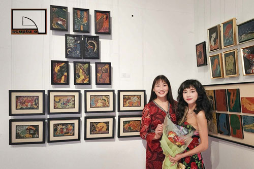 Họa sĩ Đào Yến Quỳnh và mẹ chồng - Họa sĩ Ngô Quỳnh Liên bên bộ tranh sơn mài "Vịt Con Xấu Xí".