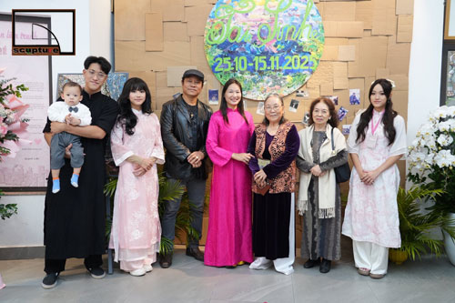Gia đình dành trọn tình yêu thương cho hai mẹ con (từ trái sang phải là hai cụ nội: Họa sĩ Nguyễn Văn Chư và Nhà điêu khắc Trần Tú Miên).
