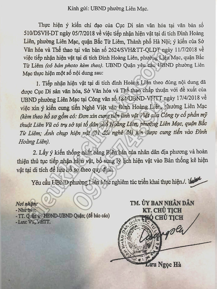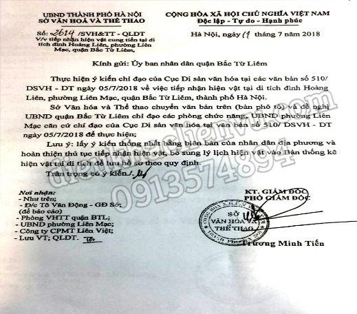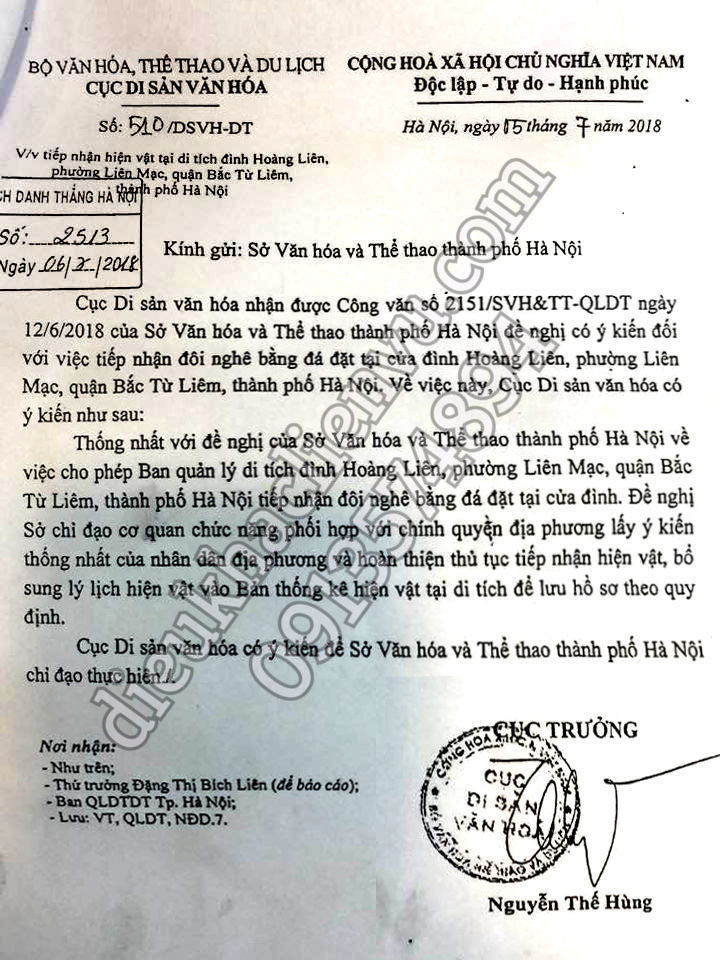 Công văn cục di sản gửi sở văn hóa về việc cho phép Đình Hoàng Liên tiếp nhận linh vật Việt