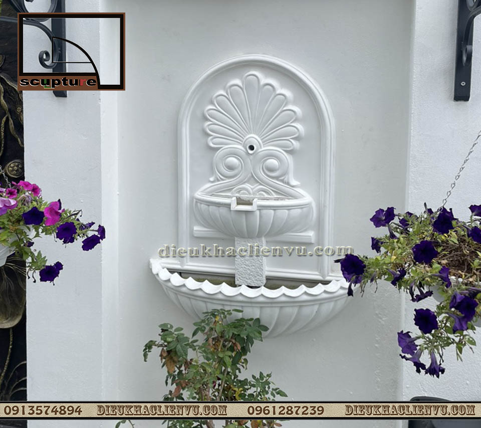 - Khác với các thiết kế đài phun nước quy mô lớn hoặc các mẫu đài phun theo kiểu tượng tròn. Phù điêu đài phun nước sân vườn được thiết kế vô cùng đơn giản, tiện lợi cho việc lắp đặt và đặc điểm ưu việt lớn nhất là tiết kiệm diện tích vì được gắn trực tiếp lên tường vườn hoặc ở vị trí góc vườn trống.