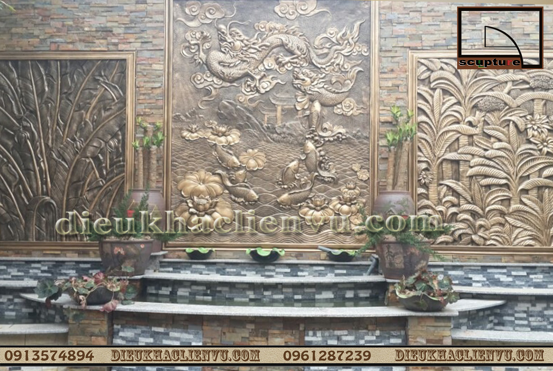 - Hay bức tranh phù điêu hoa lá sen và cá chép, bên canh ý nghĩa tốt đẹp, cao quý của loài quốc hoa. Thì tranh phù điêu hoa sen và cá chép với hình ảnh loài cá đặc biệt, được hình tượng như cá thần gắn với hình ảnh vị thần cai quản bếp trong văn hóa Việt Nam. Theo quan niệm phong thủy, chín con cá chép theo nghĩa Hán Việt là “Cửu Ngư” tức là sự vĩnh cửu, bền vững của tài lộc, thịnh. Bức tranh phù điêu hoa lá sen và cá chép gây ấn tượng, thể hiện ý nghĩa về sự tụ họp, sinh sôi nảy nở và vương vầy, hạnh phúc của cuộc sống. Nhìn ngắm bức tranh, người xem ấn tượng với phối cảnh trên bố cục lấy chín chú cá chép tập trung ngay chính giữa và hương sen tỏa ngào ngạt xung quanh. Bức phù điêu hoa lá chủ đề sen và cá chép với sự quần tụ này thật sự không chỉ khơi gợi cảm giác như trở về cõi miền xa xăm yên bình trong ký ức. Mà nó còn ẩn chứa những mong ước tốt lành cho một cuộc sống an yên.