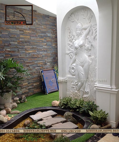 - Vì thế mà sự kết hợp giữa hình tượng cô gái với hành động đang đổ nước trong bức phù điêu cô gái bê bình đổ nước không chỉ mang tính thẩm mỹ cao mà còn hàm ý thể hiện mong muốn của gia chủ muốn rước tài lộc vào nhà. Bên cạnh làm vật trang trí, hình tượng cô gái đổ nước còn mang ý nghĩa phong thủy nên được lựa chọn nhiều.