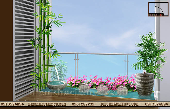 - Vì là vị trí tiếp xúc gần với bên ngoài, chịu nhiều mưa nắng, mặt sàn nên chọn loại trống trơn hệ thống thoát nước nhanh tránh ứ đọng, để thiết kế tiểu cảnh trang trí cho ban công đẹp yếu tố đưa đài nước là điểm nhấn chủ đạo đang được mọi người lựa chọn nhiều nhất, ngoài áp dụng lắp đặt đài nước đặt đất cũng có thể lựa chọn trang trí tiểu cảnh ban công giới đài nước châu Âu treo tường, cách này cũng vô cùng ấn tượng vừa đẹp vừa sang trọng mà vẫn đảm bảo yếu tố chuẩn phong thủy hút tài lộc tăng Vượng khí cho chủ nhân.