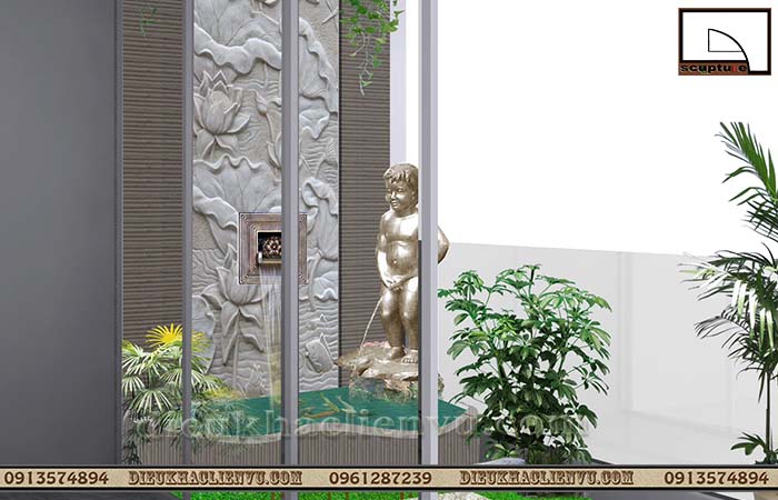 - Một số thông tin cũng như mẫu về các thiết kế tiểu cảnh ban công đẹp sẽ được giới thiệu dưới đây, với điểm nhấn là đài phun nước qua hình ảnh mô phỏng một cậu bé đang đứng tè rất ngộ nghĩnh và sinh động, trên tường được điểm bởi một số bức phù điêu hoa văn hải đường, và chạy đường viền bằng những hoa văn nhỏ hiện đại với họa tiết đơn giản nhưng vô cùng tinh tế.